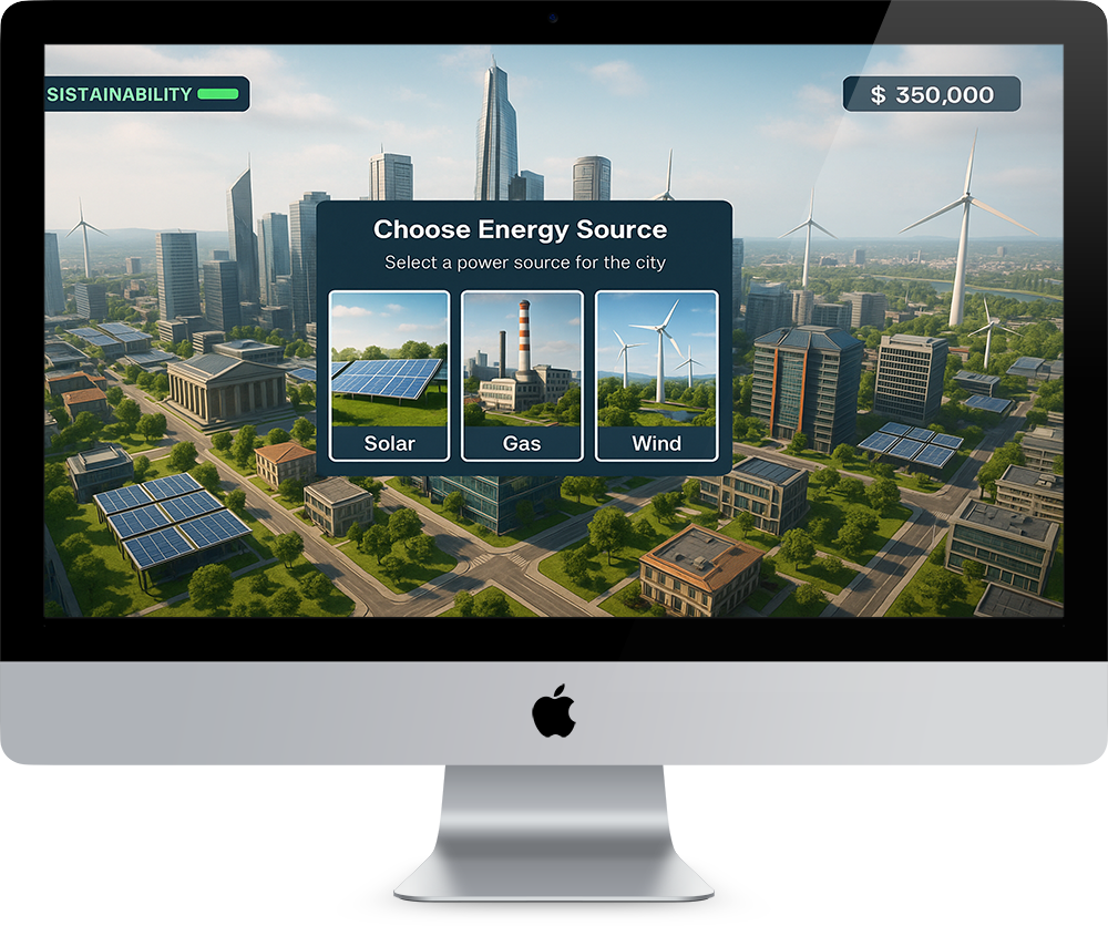 Builds awareness of sustainability challenges through interactive “what if” decision-making.