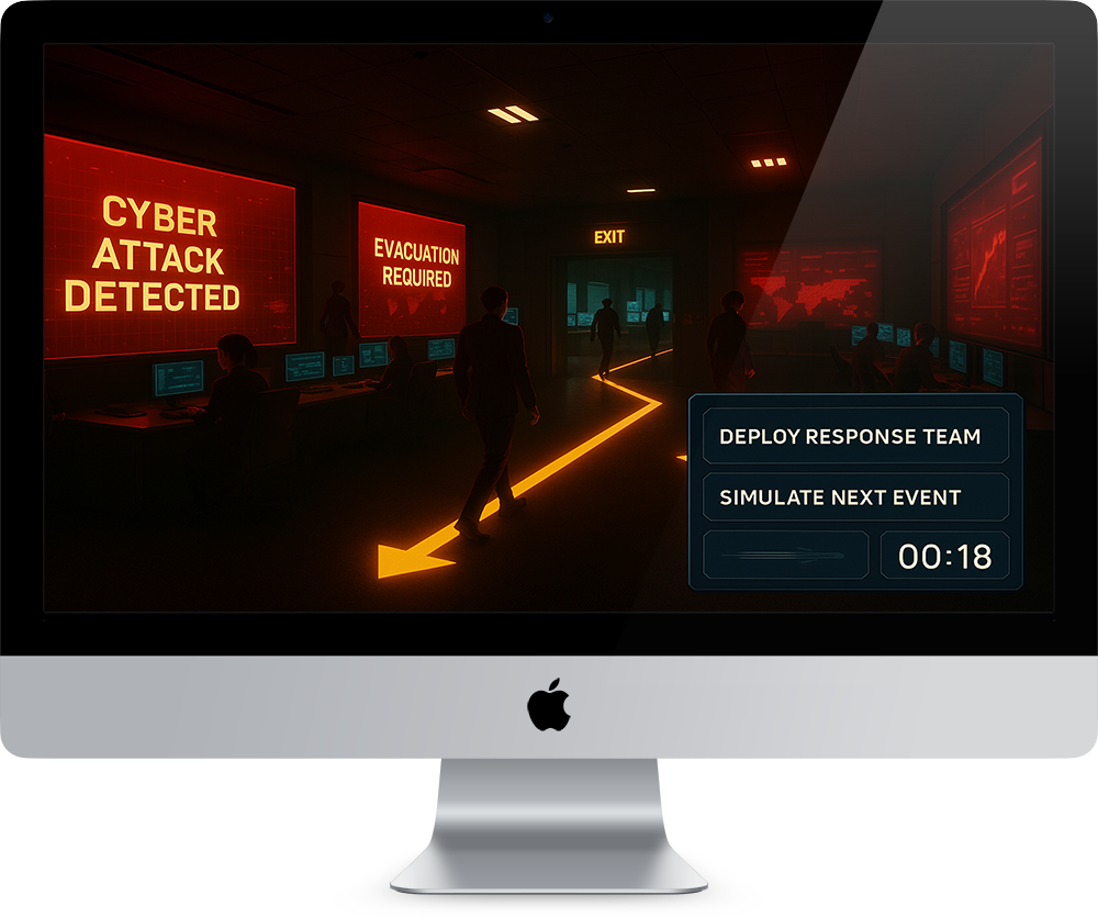 A high-stakes simulation tool for crisis management and risk training. Provides real-time emergency scenarios, command dashboards, and decision-testing environments for leadership teams.
